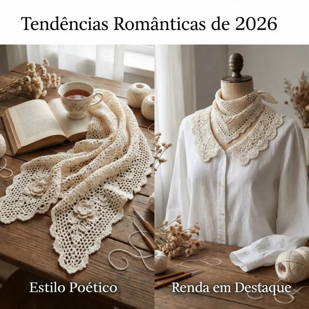 Aplicações: Xales aconchegantes, acessórios vintage e peças que parecem ter saído de um livro de literatura clássica (estilo “Poet Core”). É o momento de resgatar pontos de renda e acabamentos sofisticados.