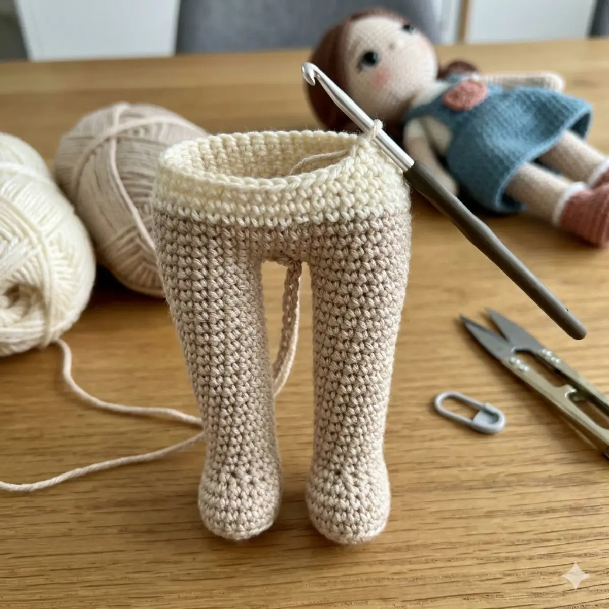 Pernas: (Marrom) Carreira *1: AM, 8 pb. Carreira *2–4: 8 pb. (Mude p/ Branco) Carreira *5: 8 pb. Carreira *6–17: 8 pb. (Mude p/ Verde Oliva) Carreira 18: 8 pb. Faça a 2ª perna e não corte o fio para unir.