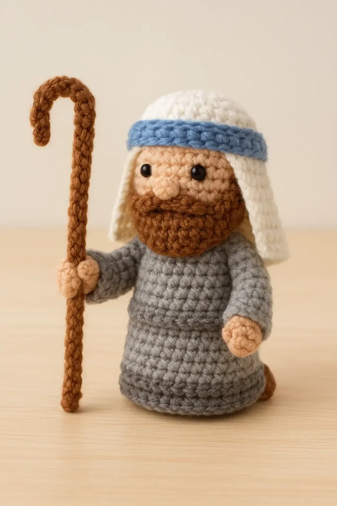 Você terá um José em amigurumi, com aproximadamente 14 cm, perfeito para compor o presépio natalino. Essa peça pode ser feita sozinha ou junto com outros personagens como Maria, o Menino Jesus, os pastores e os animais, formando um conjunto único e cheio de afeto.