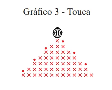 Gola (fio creme, agulha 2,5 mm): 28 correntinhas; CARREIRA 1: 27 pontos baixos; CARREIRA 2: pule 1 ponto de base, faça 6 pontos altos no mesmo ponto, pule 1 ponto de base, 1 ponto baixíssimo, repetir até o final.
