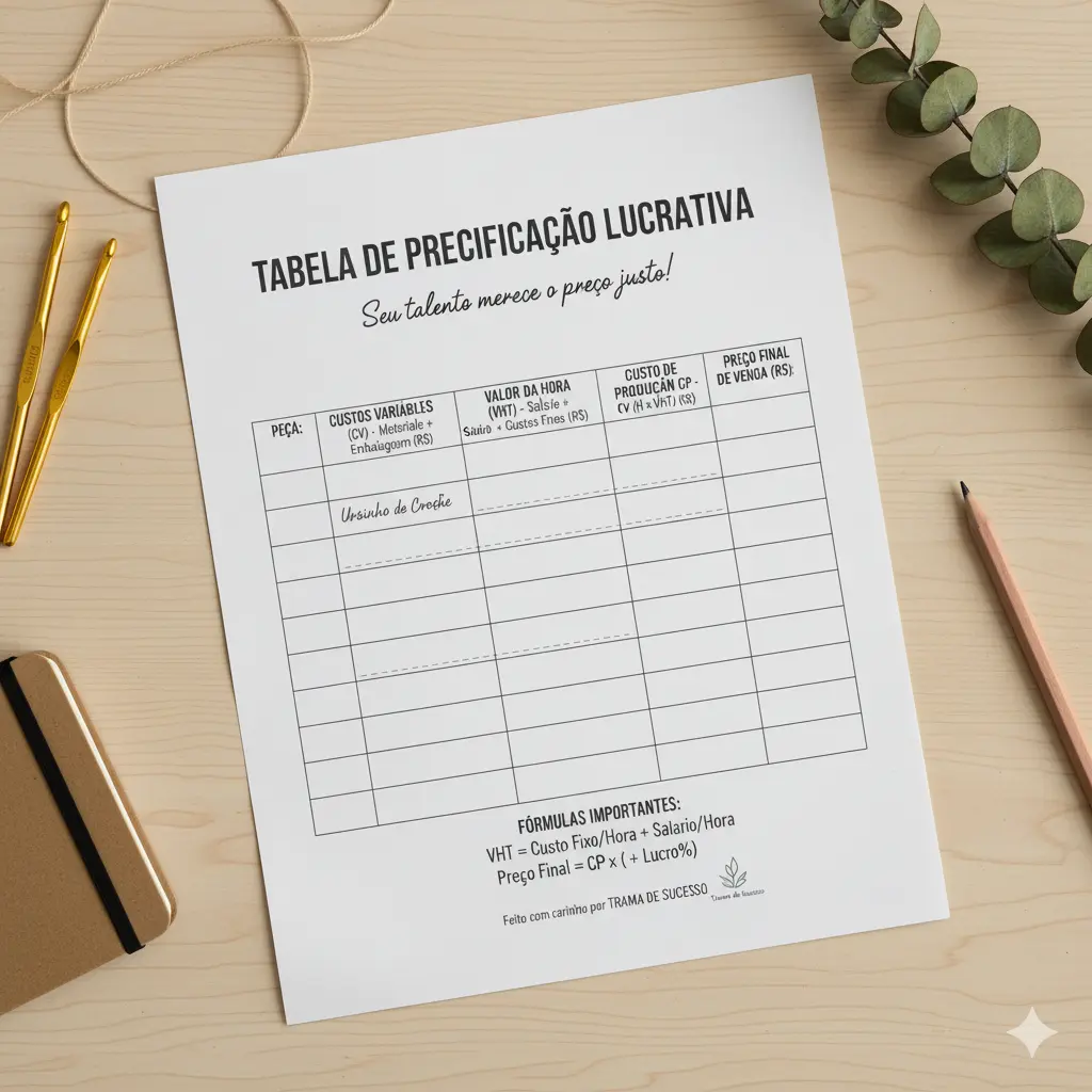 A cliente manda a mensagem mais temida do Instagram: “Qual o valor?” O coração dispara. Você olha para a peça, pensa no material, chuta um valor que parece “justo”, diminui 10% por medo de assustar, envia… e fica com aquela sensação amarga no estômago. No fundo, você sabe. Você sabe que, mais uma vez, mal pagou a linha que usou. Você sabe que, mais uma vez, pagou para trabalhar. Eu, como fundadora do Trama de Sucesso, vejo isso todos os dias. Artesãs talentosíssimas, com mãos de fada, presas no ciclo da “renda extra que não vem”. Elas acreditam no mito de que “artesanato tem que ser baratinho” ou que “ninguém paga o valor real”. A verdade? O problema não está na sua cliente. Não está na crise. Não está nem na sua concorrente que “vende mais barato”.