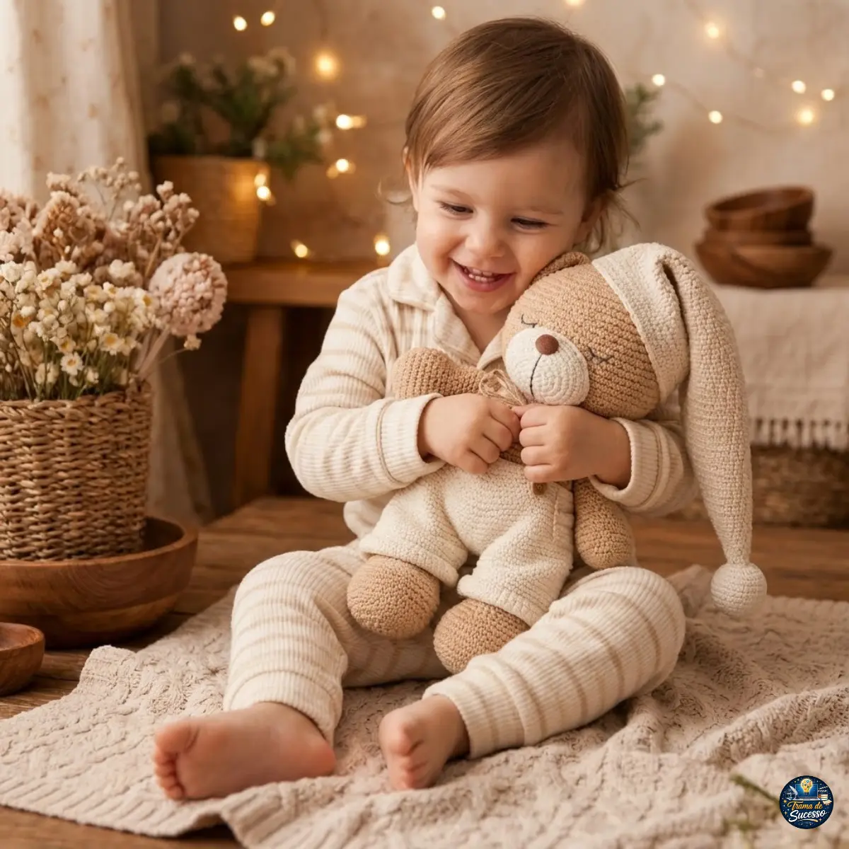Crie cenários fotográficos que evoquem a noite e o descanso: fotografe o urso dentro de um berço, sobre uma manta de tricô, ao lado de um livro de histórias infantis ou sob uma luz amarelada e suave (tipo abajur). Legendas que falem sobre “sonhos doces”, “hora da soneca” e “companheiro de berço” conectam emocionalmente. Uma estratégia de precificação e “upsell” fantástica é criar o “Kit Bons Sonhos”: ofereça o Urso Dorminhoco junto com um prendedor de chupeta combinando e uma naninha (manta de apego) com a mesma cabeça do urso. Isso eleva o ticket médio e resolve o problema do presente completo para a cliente. Outra ideia é oferecer a personalização bordando a inicial do nome do bebê na barriguinha ou na touca do urso, transformando-o em uma relíquia familiar exclusiva.