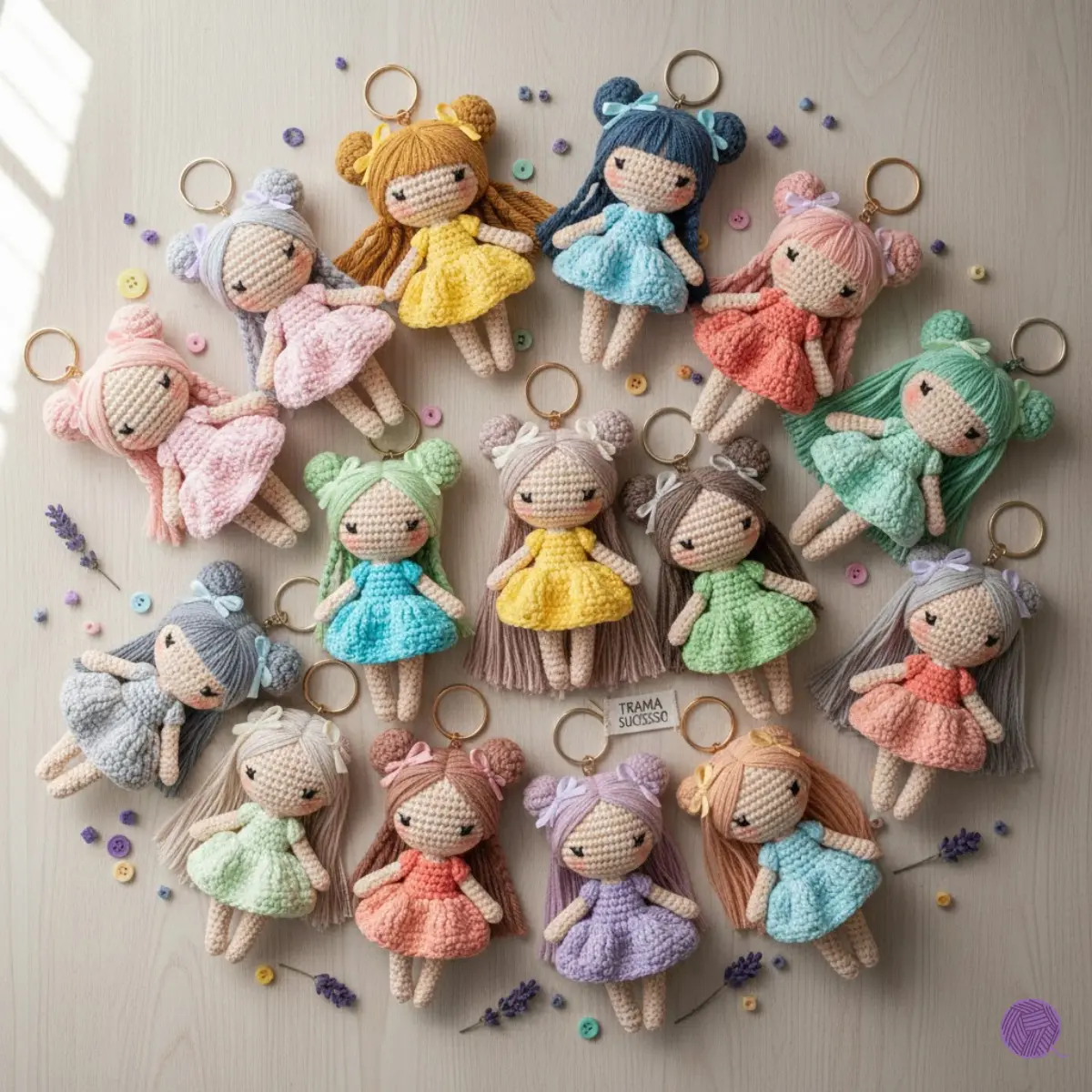 Rapidez de Produção: Diferente de uma boneca humana tradicional que pode levar dias, uma Bambola em formato de chaveiro pode ser finalizada em poucas horas. Isso permite que você tenha um estoque variado sem ficar “presa” a um único projeto por muito tempo.