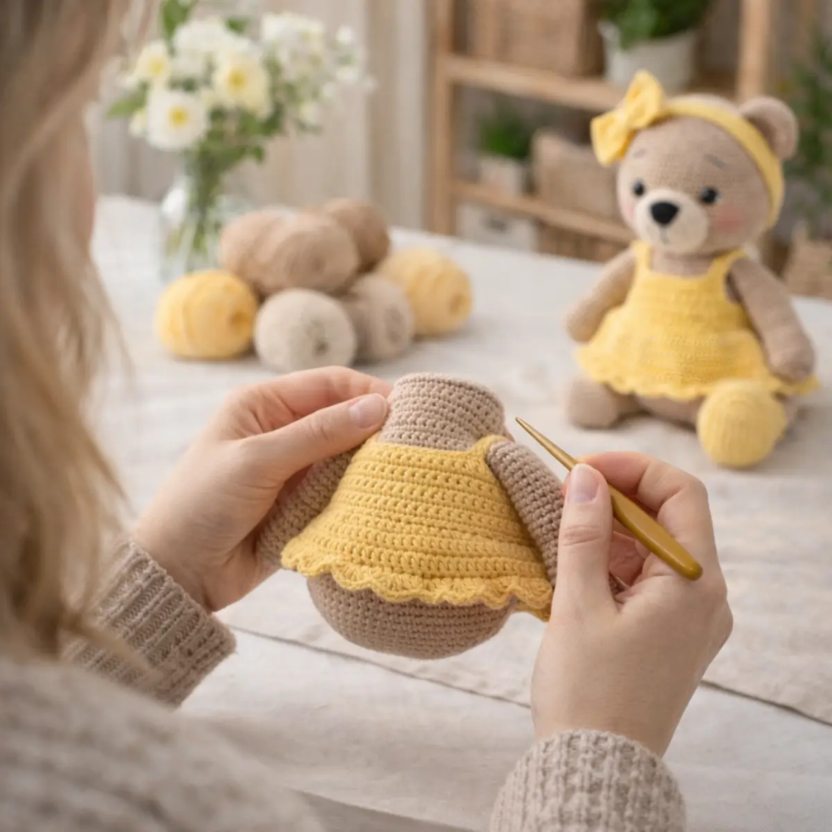 Dominar a confecção de amigurumis vestidos é um divisor de águas na carreira da artesã. Você deixa de entregar apenas um “bichinho” e passa a entregar uma experiência de moda e afeto. Capriche nas fotos, mostre a ursinha com e sem o casaco, tire um pé do sapatinho para mostrar que sai… são esses detalhes que despertam o desejo de compra e valorizam cada ponto do seu trabalho.