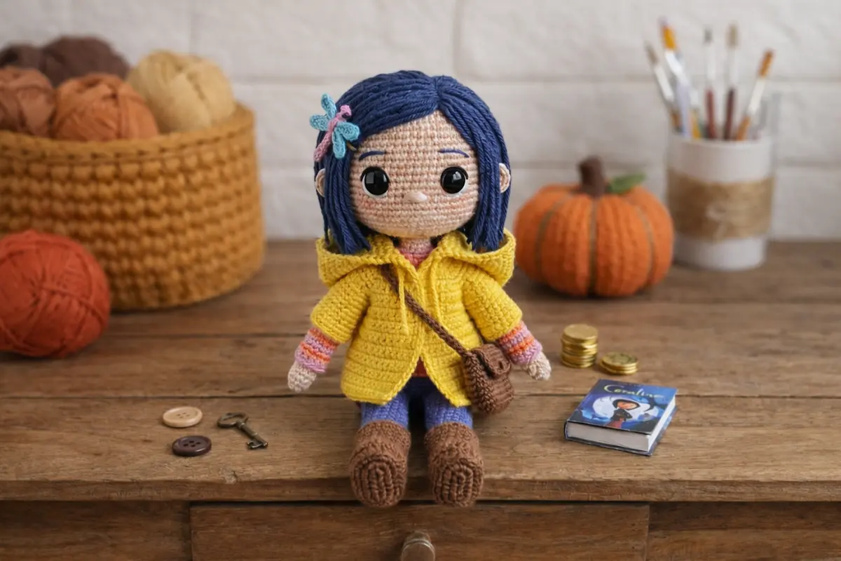 Abaixo, disponibilizo a receita completa para você que quer saber exatamente como fazer a boneca Coraline. Ela inclui a troca de cores para a roupa, a confecção da famosa capa de chuva e os detalhes que fazem toda a diferença.