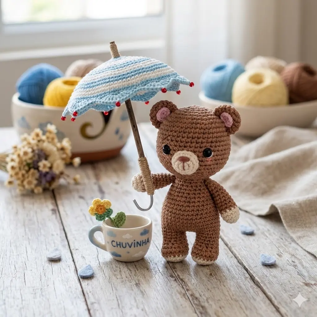 Um ursinho sozinho é um clássico. Um ursinho segurando um guarda-chuva é uma história. Ele sugere cuidado, proteção e aquele clima aconchegante de um dia de chuva em casa. No blog Trama de Sucesso, sempre reforçamos que você não vende apenas pontos; você vende a sensação que a peça transmite.