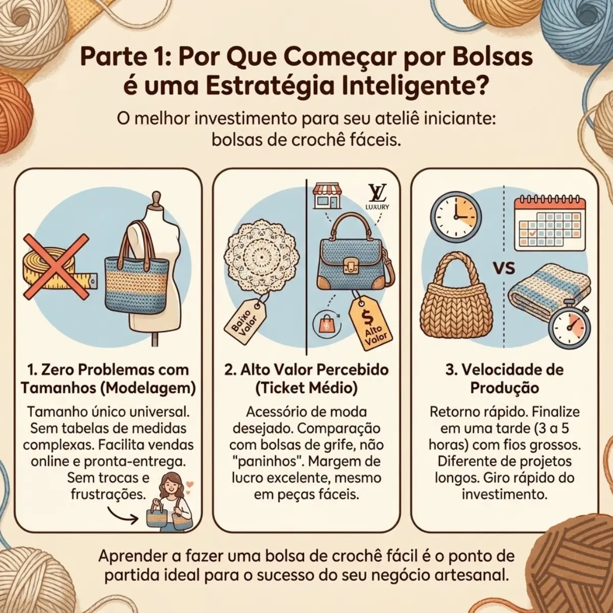 Antes de pegarmos na agulha, entenda por que dedicar seu tempo a aprender como fazer uma bolsa de crochê fácil é um dos melhores investimentos para o seu ateliê iniciante.