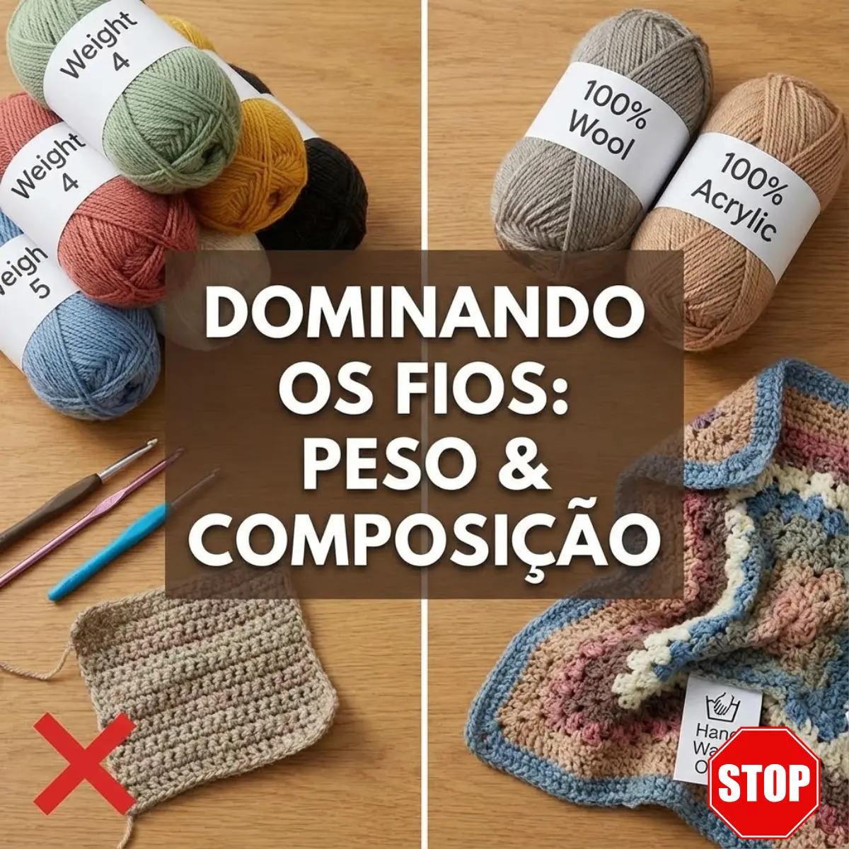 Erro Crítico: Nunca misture fios de pesos diferentes no mesmo projeto (a menos que a receita peça). Se você misturar um fio de espessura 4 com um de espessura 5, sua manta ficará com larguras diferentes e uma textura bizarra.