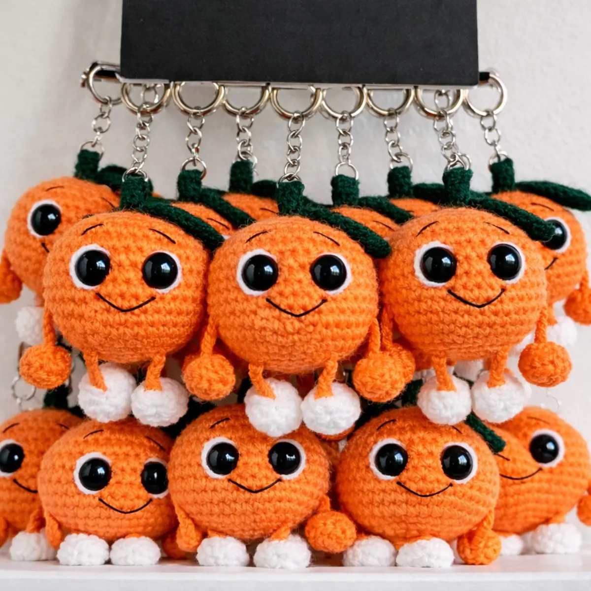 A inovação: Em vez de usar apenas a argola de metal simples de chaveiro, use um mosquetão dourado ou prateado de boa qualidade. Adicione um tassel (franja) de fios laranjas ou um pingente de acrílico junto à peça de crochê. Venda-o como um “Bag Charm” (pingente de bolsa) para dar um toque de cor a bolsas de palha ou mochilas jeans.