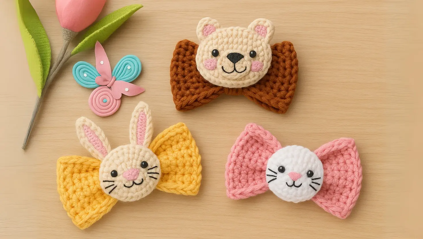 “Laços Amigurumi com Carinhas de Animais: Passo a Passo do Urso, Coelho e Gatinho”