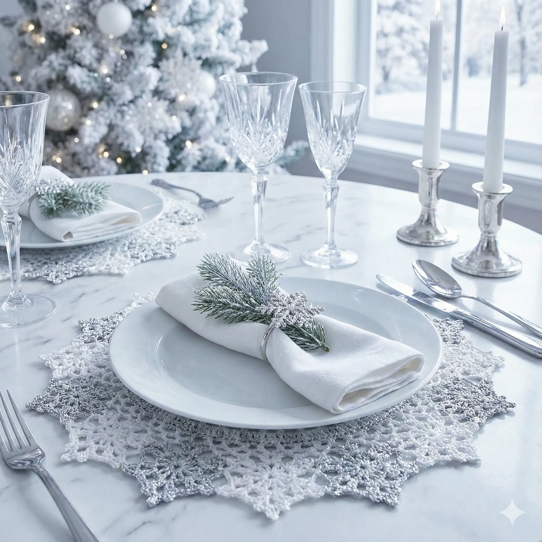 O Modelo Ideal: Se no clássico buscamos densidade, aqui buscamos leveza. Modelos vazados, que imitam renda ou flocos de neve, são a escolha perfeita. Um sousplat branco que parece uma toalha de renda engomada sobre uma mesa de madeira escura ou vidro cria um contraste deslumbrante.