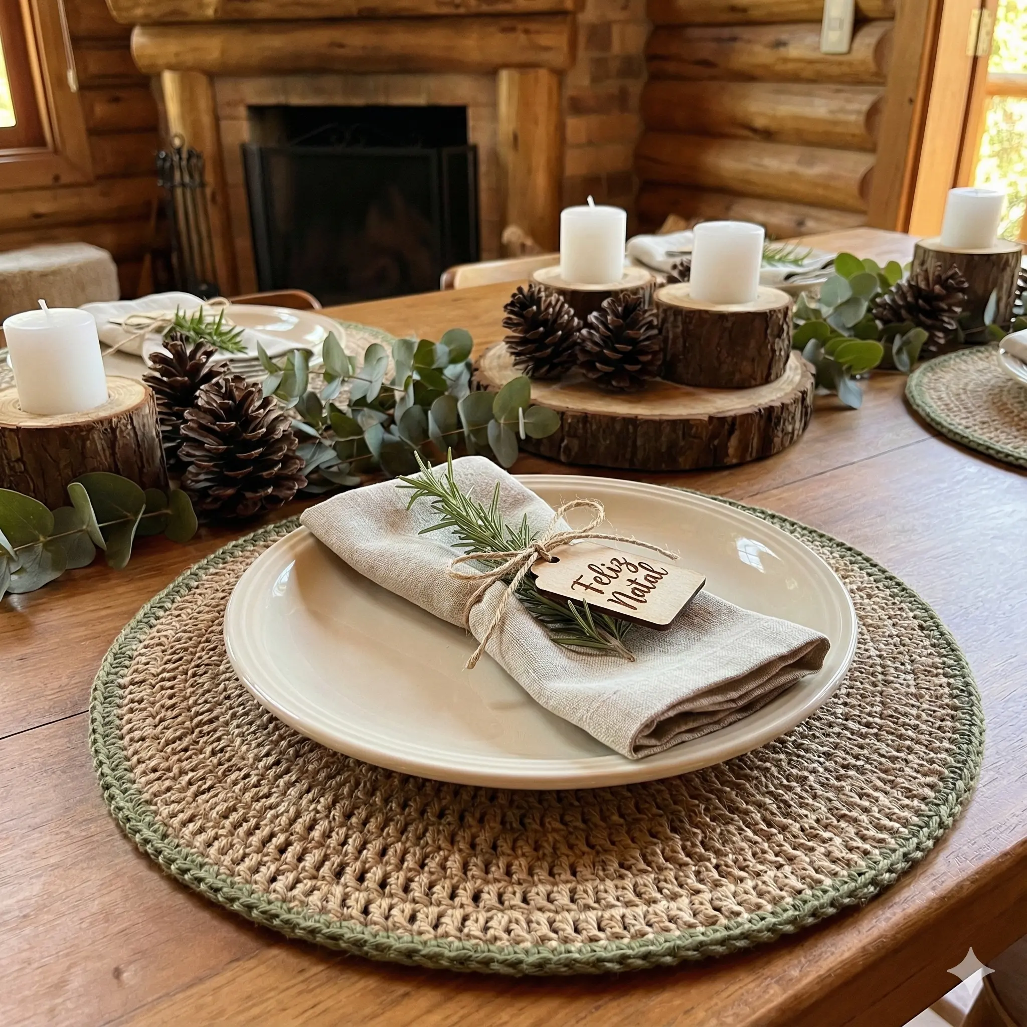 A Paleta e os Materiais: O rei aqui é a Juta, o Sisal, o Fio Náutico Bege ou o Barbante 24 fios (Spesso) sem tingimento. A cor base é a cor da fibra: areia, palha, madeira. Para trazer o Natal, usamos detalhes sutis. Não pintamos a peça toda. Fazemos apenas uma carreira de detalhe em Verde Oliva, Terracota ou Vinho. Ou aplicamos elementos: uma etiqueta de couro com “Feliz Natal”, um raminho de alecrim amarrado no guardanapo.