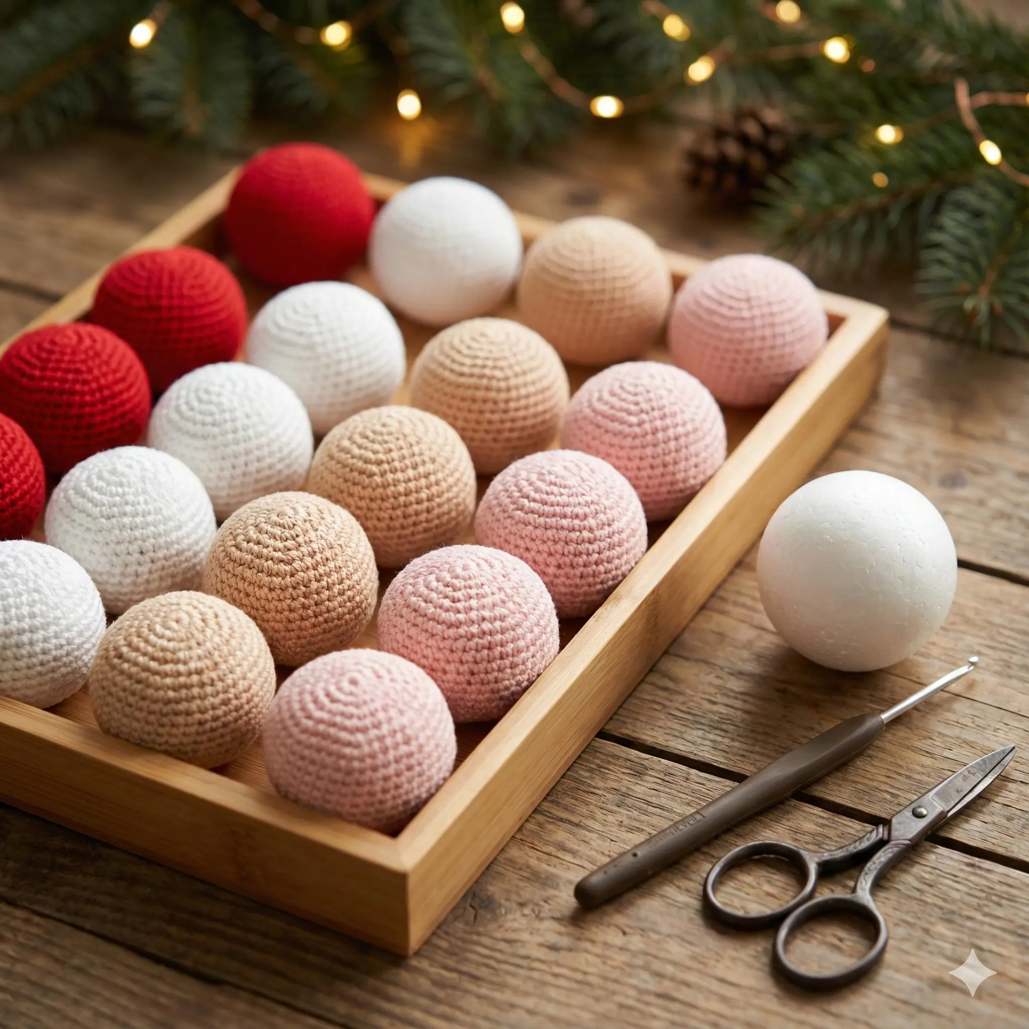 A base é feita para “abraçar” uma bola de isopor de 5cm. Isso garante que todas as suas peças tenham exatamente o mesmo tamanho, fiquem perfeitamente redondas e sejam leves para pendurar na árvore. O uso da bola de isopor também economiza enchimento e tempo de modelagem.