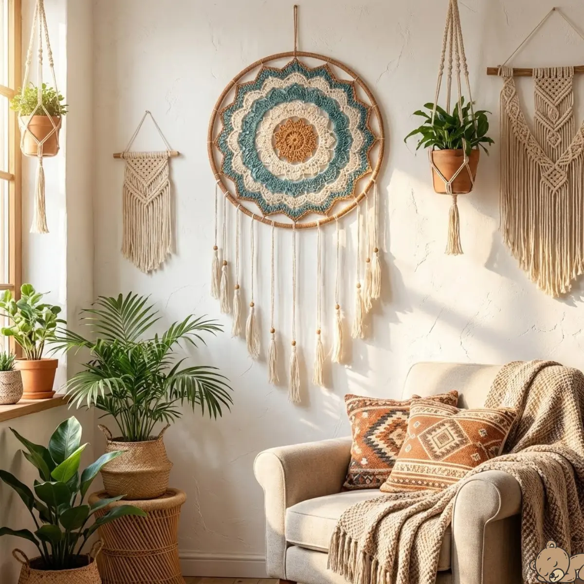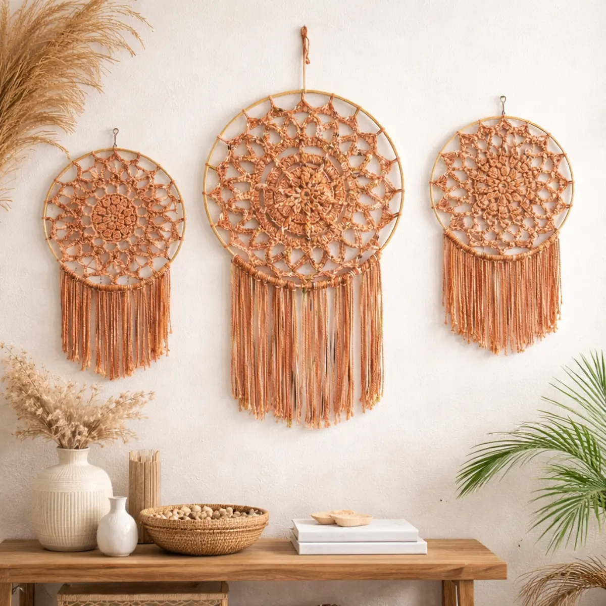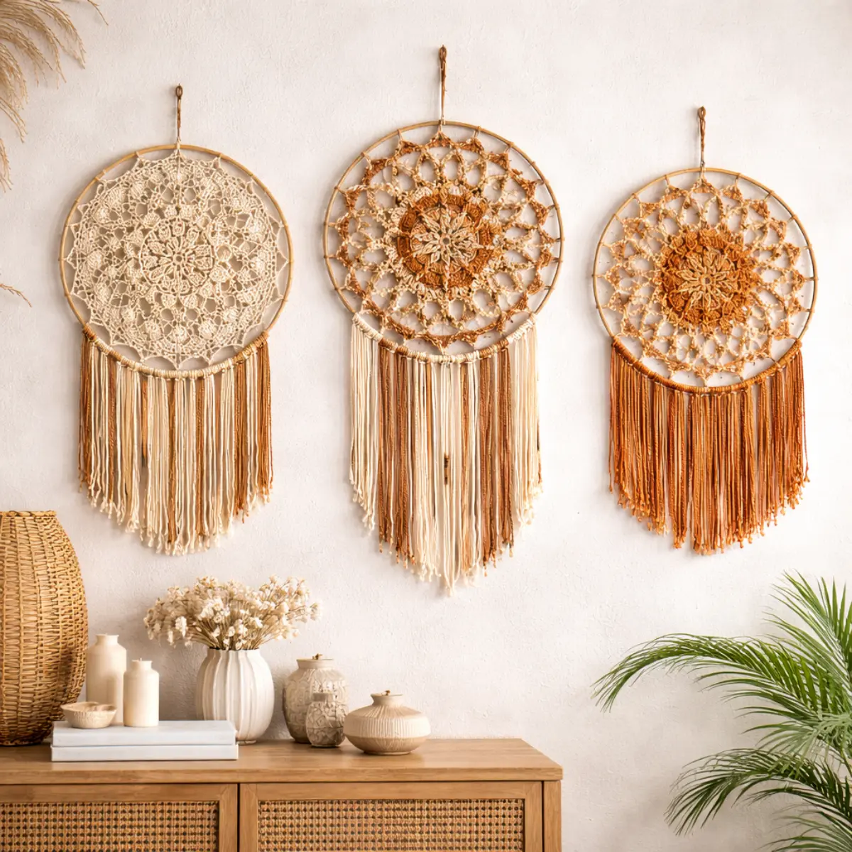 É aqui que o filtro dos sonhos brilha. Feito com aros de madeira, fios de algodão, penas e pedrarias, ele adiciona aquela camada de textura e interesse visual que falta em paredes lisas. Para quem ama a decoração boho DIY (Do It Yourself – Faça Você Mesmo), criar seu próprio filtro é a forma suprema de personalizar o ambiente, garantindo que as cores e o tamanho se adaptem perfeitamente ao seu espaço.