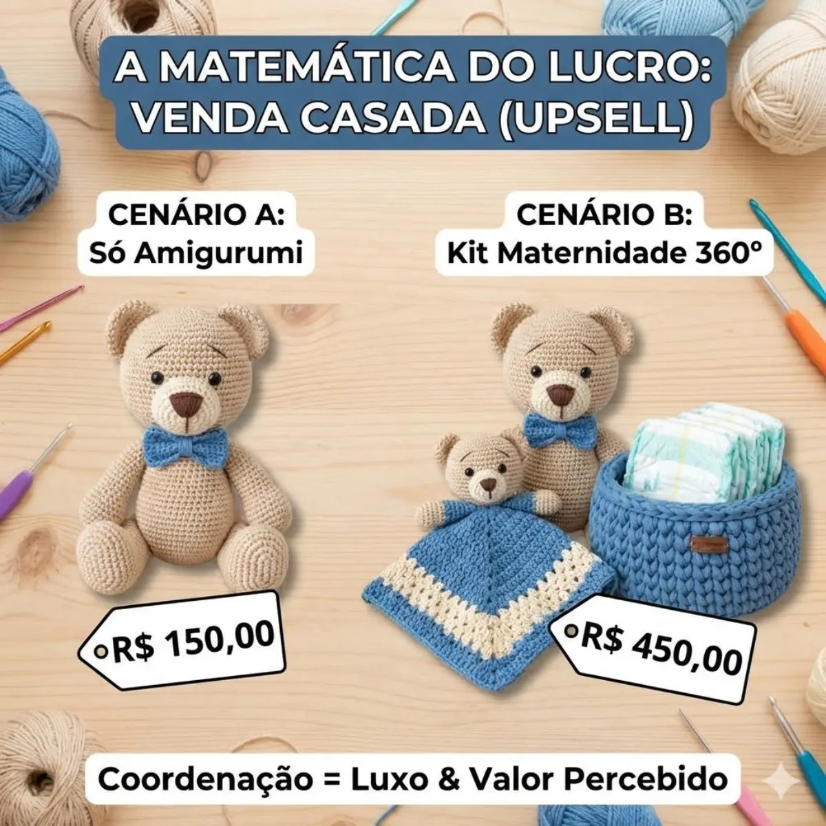 Cenário B (A Artesã 360º): Você apresenta o mesmo ursinho de R$ 150,00. Mas, ao lado dele, você coloca uma naninha (mantinha de apego) feita com o mesmo fio e cores da gravata do urso. E sugere: “Para completar, que tal este cesto organizador de fio de malha para as fraldas, combinando com o tema?”.