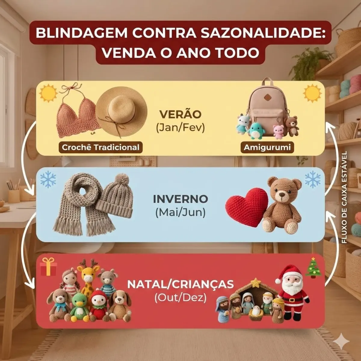 O Dilema do Inverno: Se você faz apenas amigurumi, pode sentir uma queda nas vendas em meses frios, onde as pessoas buscam conforto térmico.