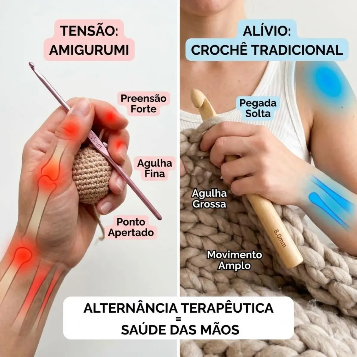 O Amigurumi: Exige uma “preensão de pinça” forte. Você segura a agulha com força, usa agulhas finas (2.0mm a 3.0mm) e precisa de uma tensão de ponto altíssima para que o enchimento não vaze. Isso sobrecarrega os tendões flexores dos dedos e o polegar. É um trabalho de foco e tensão.