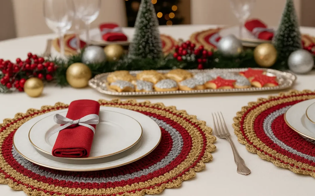- Ao fundo, desfocado, um detalhe sutil: luzes de Natal (bokeh), uma mini árvore, bolas douradas. O foco é o sousplat!