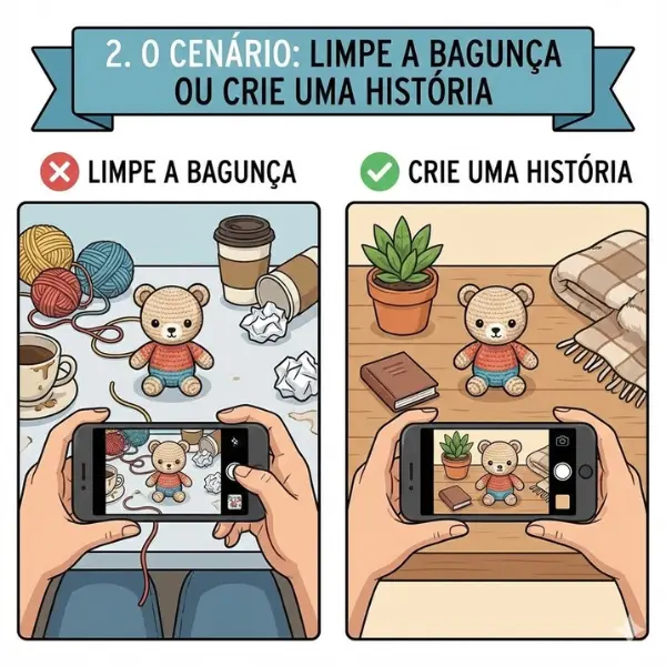 Ninguém quer comprar um amigurumi de luxo vendo a louça suja na pia ou o cesto de roupa atrás dele. O fundo da foto precisa ser intencional.