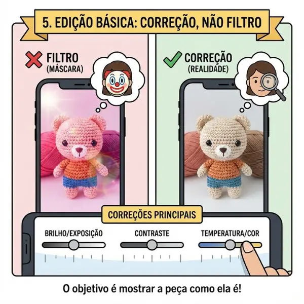 A edição serve para corrigir o que a câmera não captou bem, não para mascarar a realidade. Cuidado com filtros prontos do Instagram que mudam a cor do fio. A cliente vai ficar frustrada se comprar um urso bege e receber um marrom.