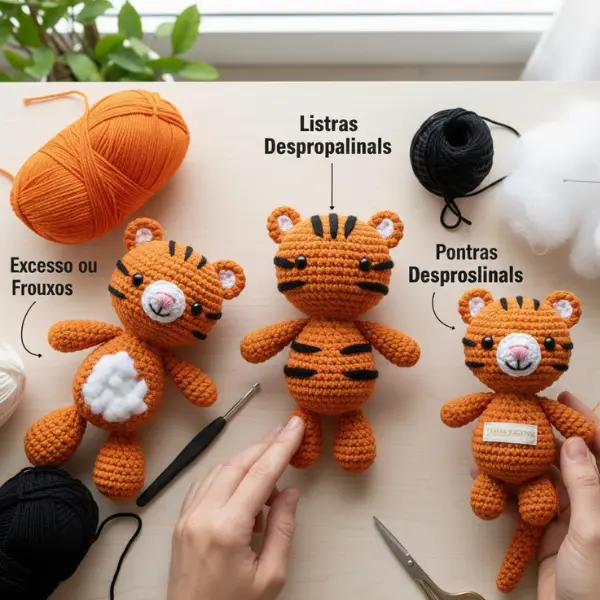 Excesso ou Falta de Enchimento: Um tigre “mole” perde a forma, e um tigre “duro demais” pode estourar os pontos. O ideal é um enchimento firme, mas que ainda permita um leve aperto.